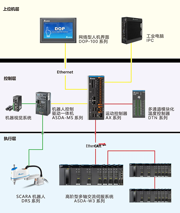 组件生产工艺对快速且精准的搬运有着高要求,台达SCARA机器人重复定位精度±0.015mm,集成同步纠偏检测的台达机器视觉系统,生产稳定性与效率同步提升。