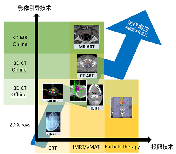 虽然IGRT可以微调患者摆位提高治疗位置与计划位置的匹配度,但对于分次治疗中器官的移动、组织形态改变等造成的位置偏差无能为力。为了解决治疗时,患者肿瘤及正常组织改变(包括:组织形态变化、位置移动、胃肠道气体及膀胱充盈程度差异等)对照射剂量分布的影响,自适应放疗(Adaptive RT, ART)允许根据患者治疗时的状态对放疗计划进行调整。ART代表了IGRT的下一个发展前沿。ART可以根据肿瘤的治疗表现并结合周围相邻正常组织的位置对肿瘤当天的治疗剂量和靶区进行修订。