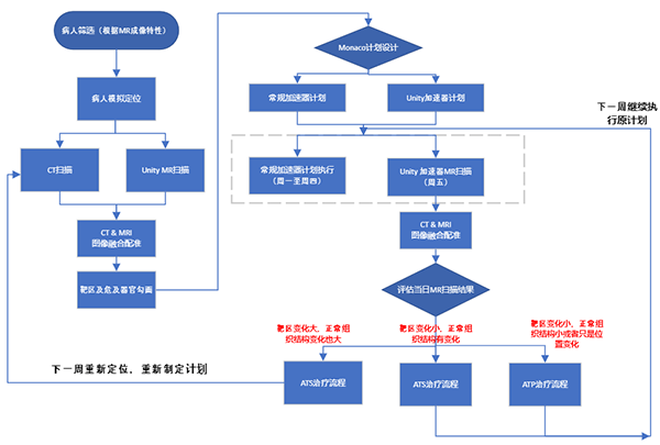 在磁共振引导放射治疗执行治疗的过程中,医生会根据每周五Unity治疗前扫描的MRI图像评估病人靶区及危及器官的形状变化。如果病人各项结构变化不大或者没变化,则病人当天按照ATP治疗流程在Unity上完成治疗,同时下周一到周四将继续使用原始常规加速器计划在Synergy常规加速器上进行治疗。如果靶区变化不大,但是危及器官有变化,则执行ATS治疗流程,在线调整危及器官后病人完成当次治疗,下周一到周四将继续使用原始常规加速器计划在Synergy常规加速器上进行治疗。如果靶区或者重要的危及器官同时变化大,当日按照ATS流程进行治疗,在线调整靶区和危及器官,完成当次治疗。之后当天带患者重新进行模拟定位CT扫描和MRI-sim扫描,根据最新的影像学变化重新制定常规加速器与磁共振加速器计划,下周一至周四将使用新的常规加速器计划在Synergy常规加速器上进行治疗。此后数个循环均按此步骤执行,直到患者结束治疗。