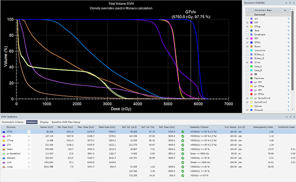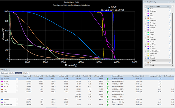 Unity计划使用11野的固定野IMRT,处方剂量:57.5Gy/25Fx,与Synergy常规加速器计划处方要求相同。下图为Unity第一次治疗Monaco参考计划的DVH Statistics信息。