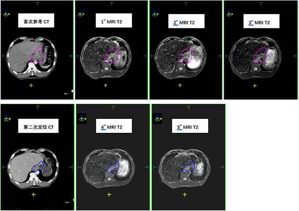 病人每周除了执行四次Synergy常规加速器CBCT影像引导放射治疗外,每周最后还会执行一次Unity MRI影像引导自适应放射治疗,医生通过每周一次的Unity治疗前MRI T2序列图像可以清晰的看到病人肿瘤及危及器官的变化情况。