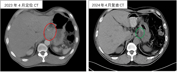从CBCT影像引导联合Unity高场强磁共振影像引导的交互式自适应放疗流程方案的提出,再到临床患者的治疗结果来看。患者在2023年4月份接受了该交互式自适应放疗方案,全程SynergyCBCT影像引导IGRT放疗20次,Unity磁共振影像引导放疗5次。而后复查血常规、血生化未见明显异常,患者生命体征平稳,患者办理了出院手续。2024年4月份患者再一次到医院进行复查,从复查CT及随诊结果看,患者肿瘤缩退明显,基本未见放射性损伤表现,临床表现为接近CR。下图为一年后随访结果与之前CT的靶区情况对比。