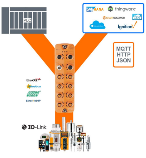 PLC仅使用5%的传感器信息。信息的数据量仅以字节衡量,且循环时间为ms级。而ifm的Y 形链路可直接提供 95% 的过程数据,且在不使用PLC干预的情况下让传感器能直接与SCADA、MES、ERP和CMMS等系统通信,并仍向PLC发送用于机器控制的信息,实现IoT的数据采集。