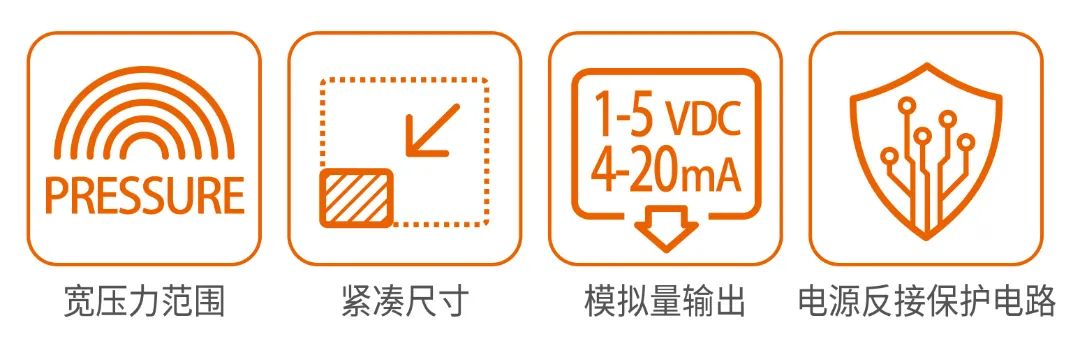PSS系列模拟压力传感器采用矩形设计,尺寸紧凑。采用模拟电压/电流输出,可直接与HMI,PC,PLC连接,并且具有宽额定压力范围,适用于各种工作环境。