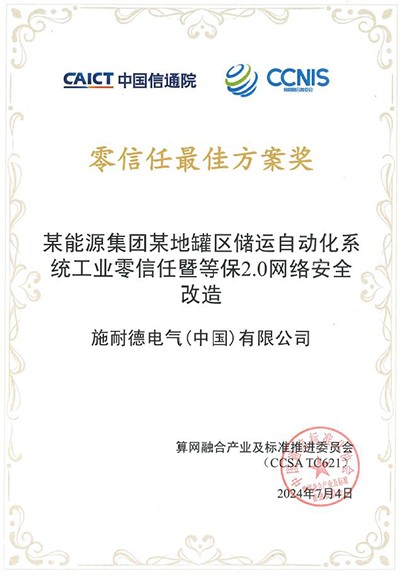 日前,在由中国信息通信研究院(下称“信通院”)、中国通信标准化协会算网融合产业及标准推进委员会(CCSA TC621)共同主办的“2024算网融合产业发展峰会”上,施耐德电气工业零信任解决方案入选信通院《零信任产业图谱》,并凭借“某能源集团某地罐区储运自动化系统工业零信任暨等保2.0网络安全改造”项目获得“零信任最佳方案奖”。