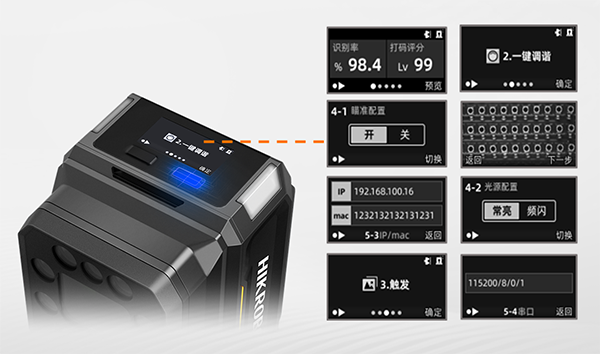 新增OLED显示屏,通过与按键联动,无需PC即可实现确认主机信息、读码状态实时查看、读码器参数轻松设定和快速复制等功能。