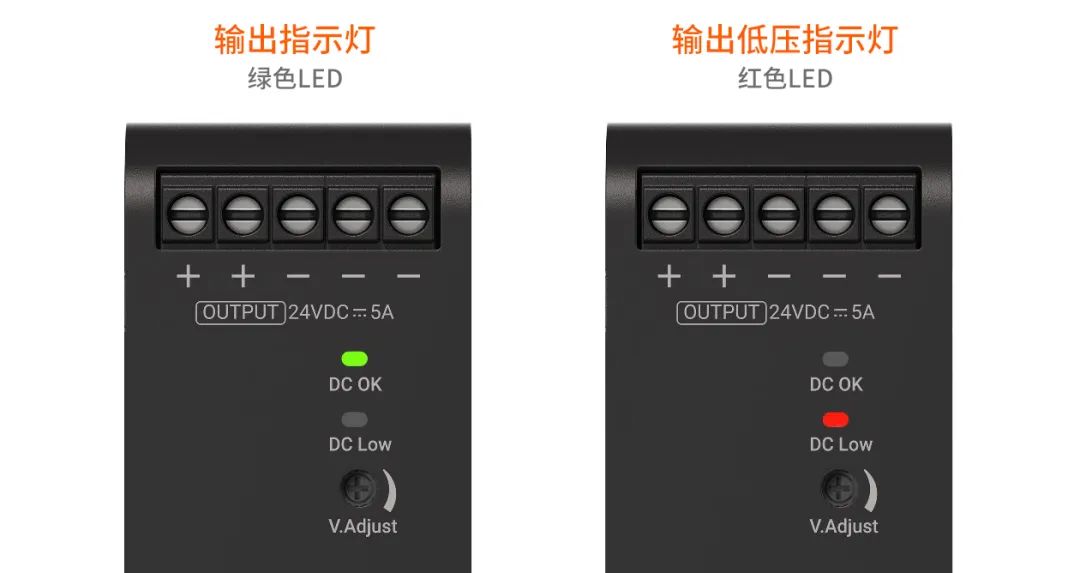 • 低输出电压指示灯(红色LED),输出指示灯(绿色LED)