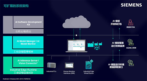 特别是在人工智能方面,西门子可扩展的工业人工智能架构,实现了从云到边缘端的模型发布、迭代和管理,可显著提升工厂效率。通过AI模型管理套件工具,包括AI SDK、AI Model Manager、Vision connector和AI Inference Server,西门子为数据科学家和自动化工程师提供了从模型创建到运行的完整解决方案,以加速工业人工智能在边缘侧的部署和应用。