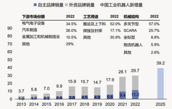 我国是全球最大的工业机器人市场。近年来,我国机器人产业发展迅猛,工业机器人装机量全球第一,制造业机器人密度达到每万名工人392台。受益于3C、光伏、锂电、汽车等高端制造业的蓬勃发展,2021-2022年我国工业机器人销量大幅提升,从2020年的不到18万台提升至2022年的28-30万台,其中三分之一的需求来自电气电子行业,26%来自汽车制造行业;同时单台价值量、操作自由度和可编程性能更高的多关节型机器人销售占比达到57%。根据MIR睿工业预测,2025年国内工业机器人销量有望达39.2万台。