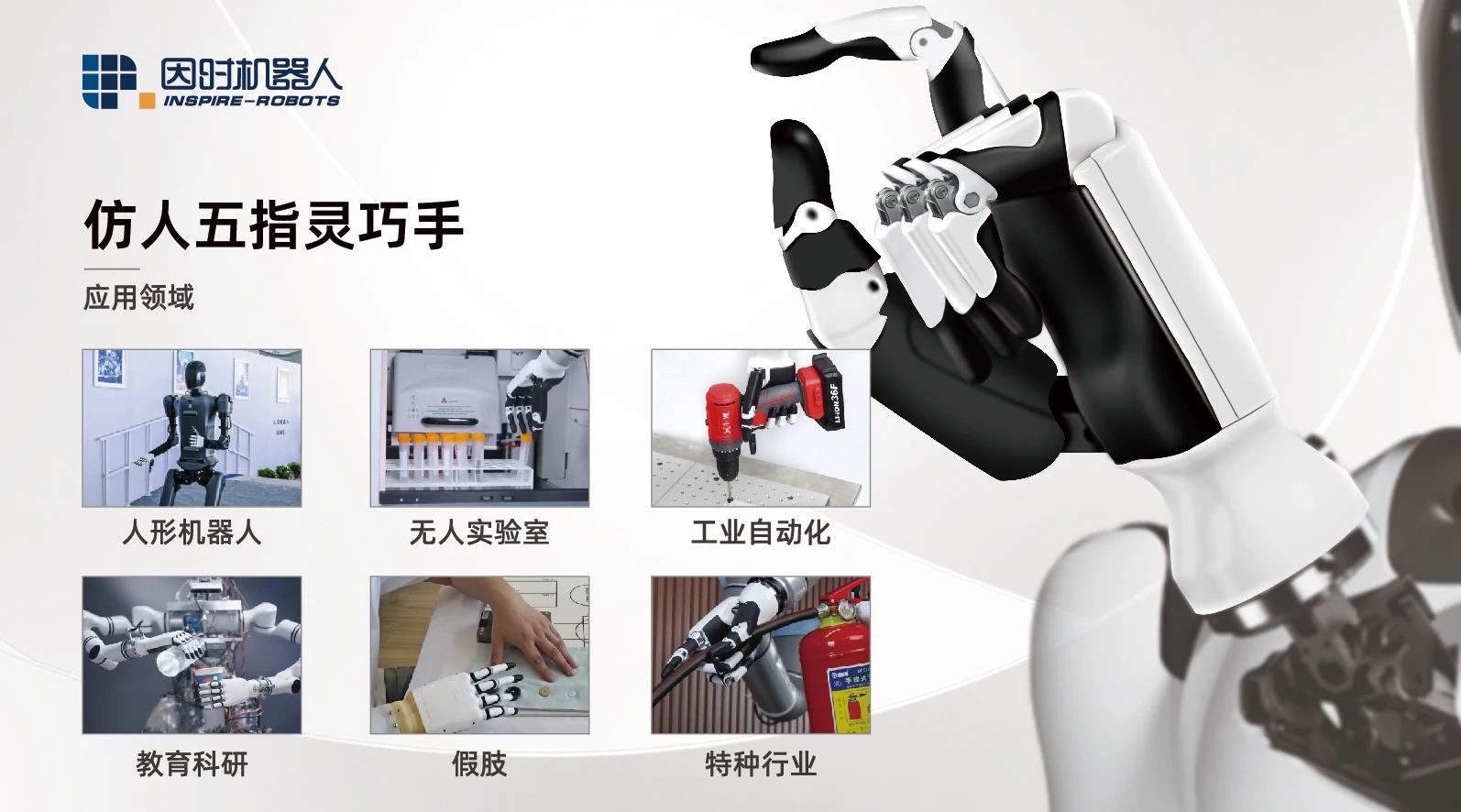 因时机器人的仿人五指灵巧手采用创新型直线驱动设计,内部集成了6个力控微型伺服电缸。单手具有6个自由度和12个运动关节,外形美观且高度仿真,结合力位混合控制算法,具有亚毫米级定位精度和数千克的负载能力,可以模拟人手做出诸如弹琴、泡茶、猜拳等复杂动作和精准抓取。仿人五指灵巧手是国内首款商业化五指灵巧手,突破多项技术瓶颈,得益于灵巧手核心零部件-微型伺服电缸自研自产等优势,使灵巧手成本大幅降低,并获得国家重点研发计划“智能机器人”重点专项支持。