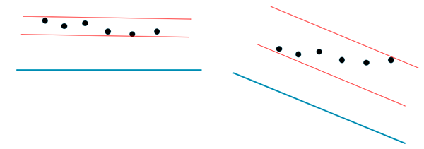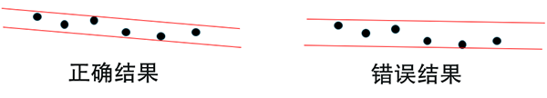 以上是对理想情况下的解释,在实际情况下平面上的测定点不在同一平面上,它的平面度算法是取一对平行平面将所有测点全部包裹并且保证平行平面之间距离最小,为了实现这个“最小”平行平面不是一定要水平,如下图所示,黑点是实际测点、红色平行线是包裹实测点的平行平面,左边是正确的计算右侧是错误的计算,可以看到两平行平面并不是水平的而是根据实际点位进行调整。