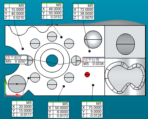 Z的最大值是0.0210,最小值是-0.0128,最大减去最小的结果是0.0338,但是这6点构造平面评价平面度的结果是0.0297。