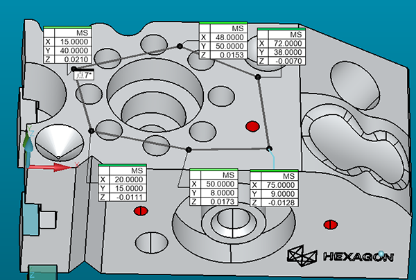 这其实类似于平行度的评价,如下图所示,评价图中6点所用的坐标系是A基准建立的,以A为基准评价此平面的平行度结果是0.0338,高度差结果也是0.0338,结果相同。