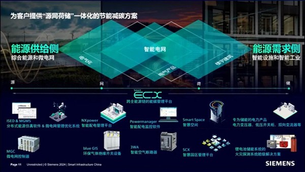 西门子提供了一套独特的“品”字形数字化解决方案。位于顶端的是西门子推出的Smart ECX智慧能碳管理平台。“品”字形的底部则由能源供给端和能源消耗端组成。供给端提供分布式能源的智能调度与运行解决方案,消耗端提供设备能源效率提升的数字化解决方案。通过Smart ECX对能源供给端与消耗端数据进行深入分析,企业能够发掘更多节能降碳的潜力与场景,从而实现更高效的能源利用和更低碳的运营模式。