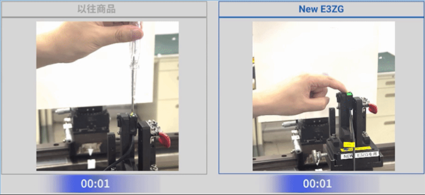 光电传感器受限于检测原理,容易受到外部的光线干扰,随着视觉类检测的普遍化,传感器往往会受到现场LED照明的影响,容易发生误检测。为此,我们开发了抗干扰算法,使得E3ZG系列即使正对LED光干扰,依旧能保持安定的检测状态,不受干扰。