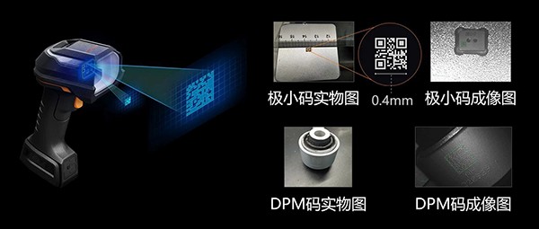 其中,极小码镜头焦距为16mm定焦设计,最佳工作距离为60mm,可读取最小模块为0.04mm的条码。极小码精准读取的关键在于创新的双瞄准器系统,融合一字线与LED光斑指示,确保两者在60mm关键距离内精准重合,为用户提供直观、无误的扫描引导,提升扫描效率。