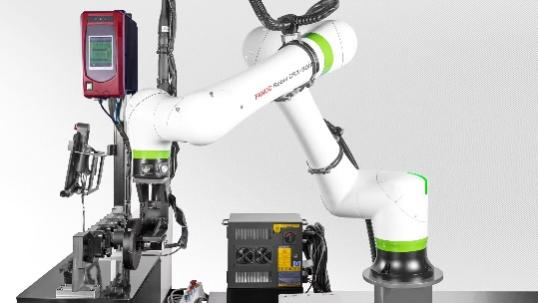 协作机器人超大扭矩拧紧及视觉追踪系统”展示了FANUC CRX-30iA机器人结合大扭矩拧紧轴,实现300Nm扭矩螺栓的自动拧紧;并搭配FANUC 实时视觉追踪技术实现通过视觉拍摄运动特征,引导机器人实时追踪运动。这套系统可应用在汽车车架装配零部件等行业,用于车架部件的拧紧装配。