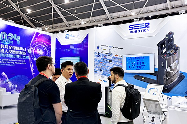 在赛那德SENAD展区,首先映入眼帘的是赛那德SENAD最新推出创新产品——iLoabot-M自主装卸机器人,这是全球首款兼容超高超宽车厢的装卸一体智能机器人。不仅能够进行货物的装卸,在特定情况下同样可以当做移动码垛机器人、拣选机器人等,替换不同的夹具就可以替代现在恶劣工况中焊接、打磨等蓝领工种,真正做到了“数字蓝领工人”。