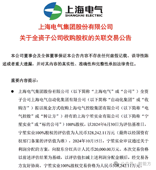 公告显示,截至2024年6月30日,上海发那科机器人公司50%股权对应的净资产为258563.57万元,占宁笙实业净资产的比例为83.7%;2024年1-6月,宁笙实业持有上海发那科机器人公司50%股权的投资收益为17845.77万元,占宁笙实业净利润的比例为109.4%,宁笙实业100%股权的评估值为约32.82亿元。经各方协商,扣除10月15日宁笙实业审议通过拟向股东分红的2亿元,交易价格约30.82亿元,增值率为6.20%。其中,评估增值主要来自发那科机器人的专利、软件著作权等资产的评估增值。