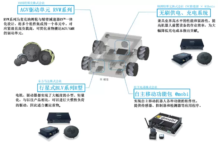 自RVW系列上市以来,纳博特斯克收到了很多客户“希望能有成车提案”的要求。纳博特斯克积极响应客户的需求,在本次展会上与AGV/AMR重要零部件的合作制造厂联合,一站式为您提供所需的综合解决方案。