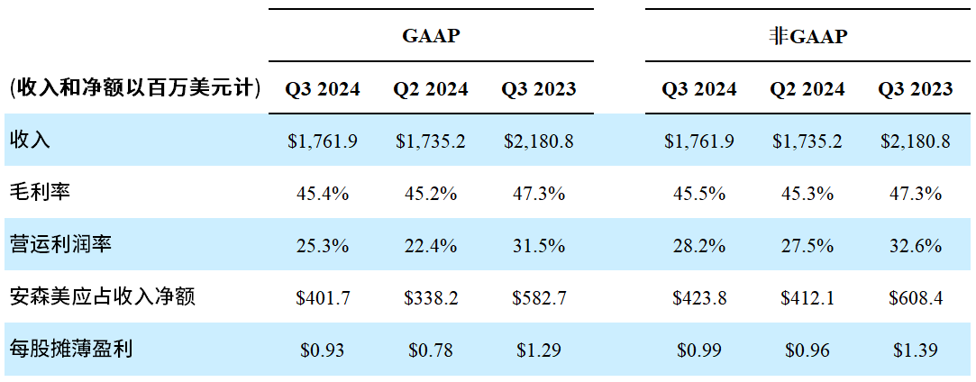 安森美(onsemi, 美国纳斯达克股票代号:ON)公布其 2024 年第三季度业绩,亮点如下: