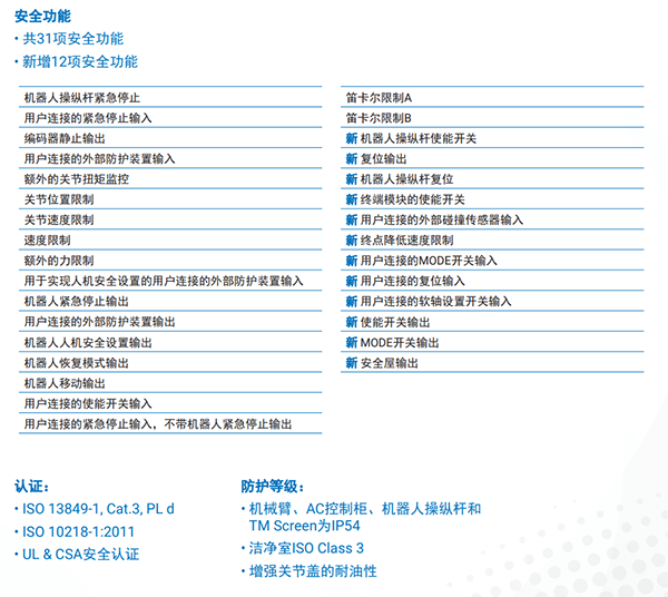 ● 配备31项安全功能,符合ISO 13849-1, Cat.3, PL D和ISO 10218 -1安全标准,并经TÜV Nord认证。新增的安全功能提供了多种安全设备/开关配置,无需额外的安全控制器。