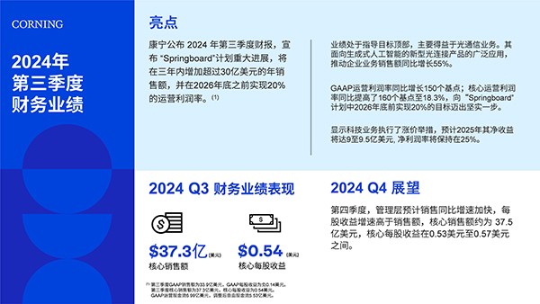 康宁董事会主席兼首席执行官魏文德表示:“我们实现了又一个强劲的季度同比增长。第三季度核心销售额增长8%至37.3亿美元,核心每股收益增长20%——超过销售速度的两倍——至0.54美元,核心运营利润率扩大160个基点至18.3%。这些结果表明,我们的‘Springboard’计划中孕育的强大增量,到2026年底,年销售额将增加超过30亿美元,并实现20%的运营利润率。”