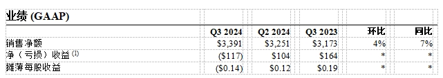 (1) 第三季度GAAP销售额为33.9亿美元,GAAP 每股收益为负0.14美元。第三季度核心销售额为37.3亿美元,核心每股收益为0.54美元。GAAP运营现金流6.99亿美元,调整后自由现金流5.53亿美元。