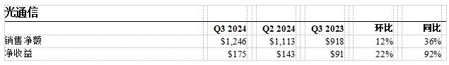 光通信第三季度销售额为12亿美元,同比增长36%,主要得益于企业业务销售额创下历史新高,增长55%。第三季度净收益为1.75亿美元,同比增长92%,主要得益于销量增长带来的强劲利润增长。