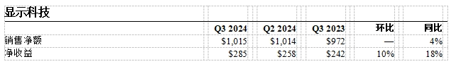 显示科技第三季度销售额为10亿美元,与第二季度持平。第三季度净收益为2.85亿美元。