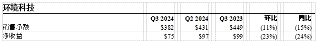 环境科技第三季度销售额为3.82亿美元,环比下降11%,主要受到预期中的北美8级重型卡车销量下滑的持续影响。净收益7500万美元。