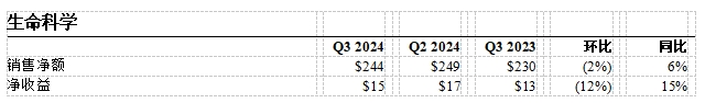 生命科学第三季度销售额为2.44亿美元,同比增长6%。净收益1500万美元,同比增长15%。