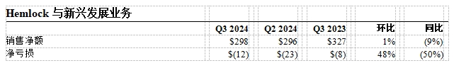 Hemlock和新兴发展业务第三季度销售额为2.98亿美元,与上季度基本持平。