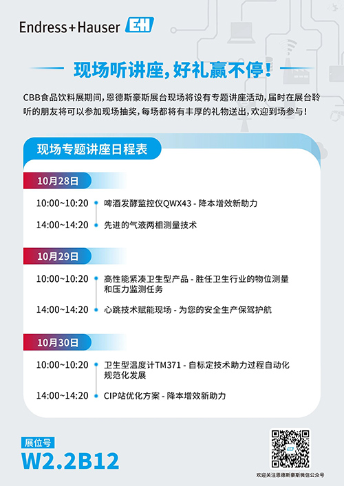 【联合云直播】智能+低碳:液态食品生产可持续创新技术时间:10月28日 10:00~11:55恩德斯豪斯将联合盖米阀门与阿法拉伐在上述时段带观众在线直击三家厂商的展台实况,逐一带看新品亮点,为无法到场参观的朋友们展示食品饮料生产的创新技术,欢迎通过恩德斯豪斯官方视频号或者以下海报中的二维码扫码围观!