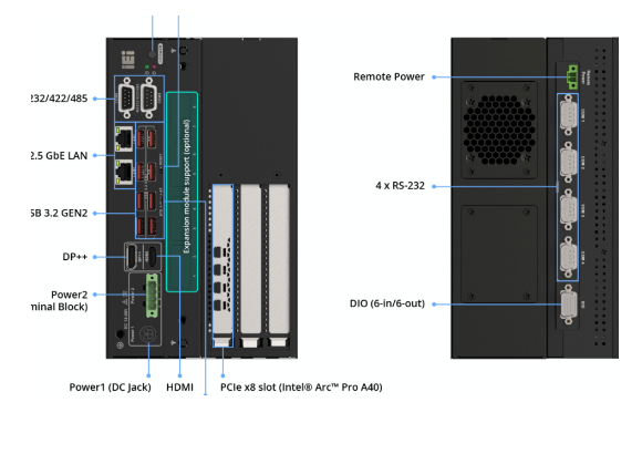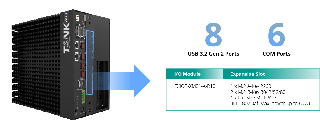 为支持更多 AIoT 解决方案,最新的 TANK-XM811 AIoT Dev.Kit 配置 8 个 USB 3.2 Gen 2 端口、6 个COM端口(RS-232/422/485)和2个2.5GbE LAN 端口,可集成各种传感器、IP cam 和其他设备。采用两个 PCIe x8 插槽进行扩展,连接 AI 加速卡、PoE 卡或各种外接卡。此外,TANK-XM811 AIoT Dev.Kit 还提供额外的 I/O 扩展模块,支持更多 PoE LAN 端口、M.2 A Key/B Key卡或全尺寸 PCIe Mini 模块,为 IT、系统集成商(SI)和开发人员打造全面的 AIoT 平台。