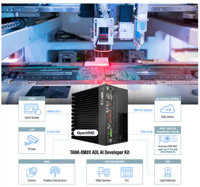 除此之外,TANK-XM811 AIoT Dev.Kit 集成了Intel® Iris® Xe 显卡,可为用户带来更高的 GPU 计算性能和速度。采用 Intel® Distribution of OpenVINO™ Toolkit 和Intel® Movidius™ Vision Processing Unit (VPU)加速卡提高 AI 性能,体验下一代 AI 应用带来的便利,为自动化业务、推理计算和数据分析倾情助力。