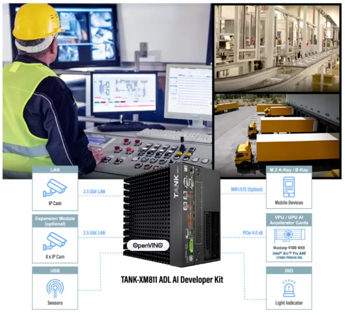 安全是确保工厂员工安全和维持生产环境的先决条件。TANK-XM811 AIoT Dev.Kit 设计有多个 USB 端口、COM 端口和 LAN 端口,可以支持多个 IP 通道或传感器。结合 Intel® OpenVINO Toolkit 和 Mustang-V100-MX8 AI 加速卡,TANK-XM811 AIoT Dev.Kit 可以提供强大的 AI 算力和图像识别来检测工人的姿势,监控限制区域或生产线,并立即发出警报和生产分析结果。借助 Tank-XM811 AIoT DEV.Kit,企业能够通过解决各种问题来实现全面和无缝的安全性。