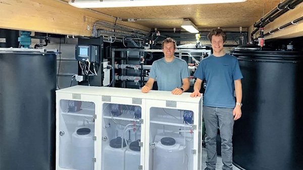 伊丽莎白公主南极科考站的工程师Nicolas Herinckx(左)和Aymar de Lichtervelde(右)站在新的水处理装置前:在最小的空间内实现可靠的高性能。