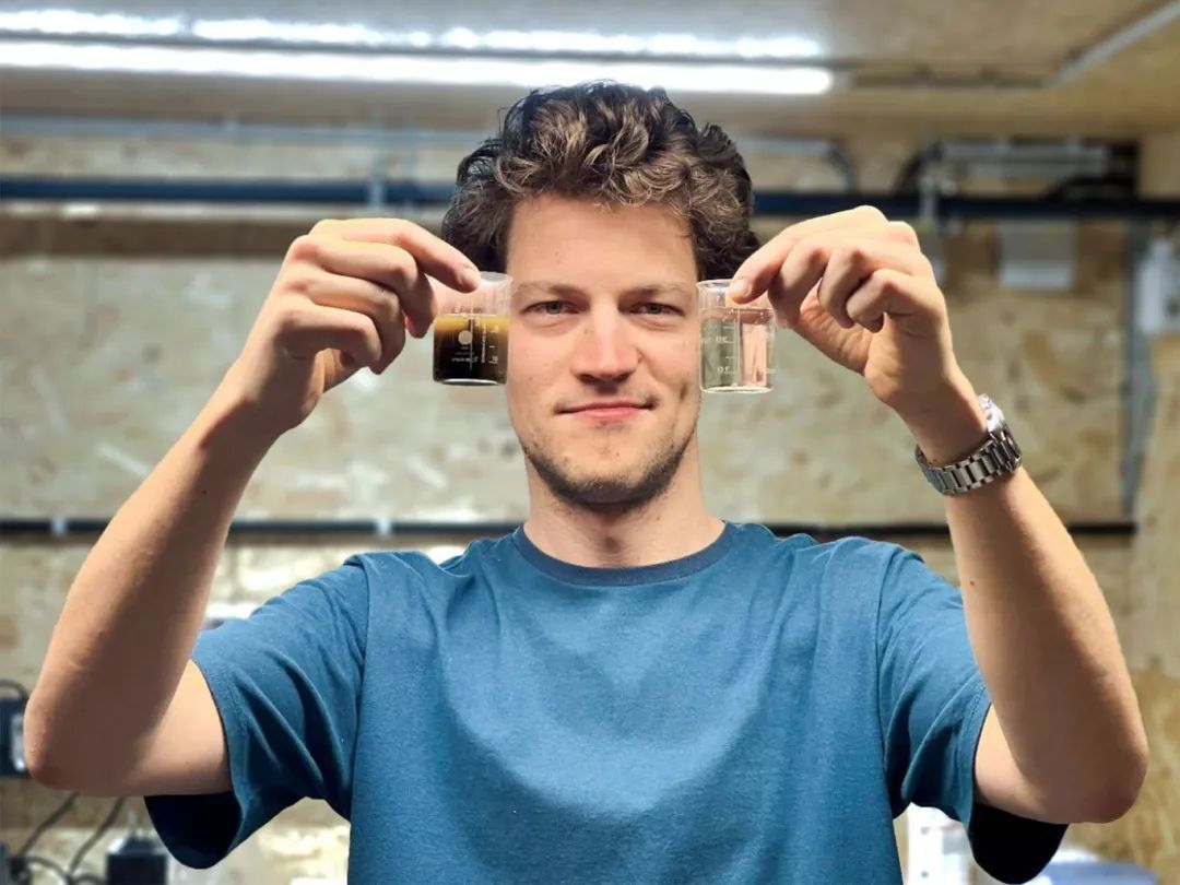 Aymar de Lichtervelde正在检查两份水样:左边是系统入口处排放的废水(这里是黑水),右边是纯化水,可以重复使用或返回自然环境。