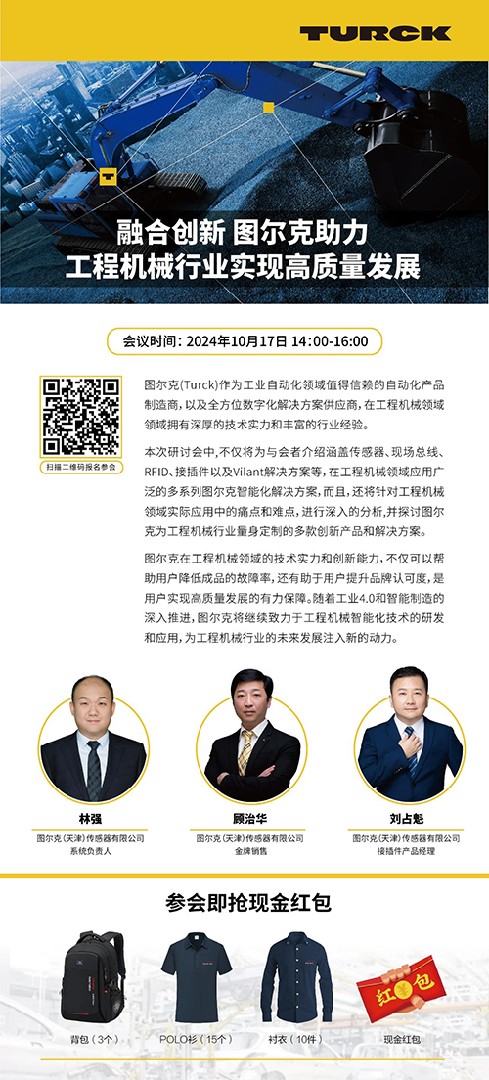 本次研讨会中,不仅将为与会者介绍涵盖传感器、现场总线、RFID、接插件以及Vilant解决方案等,在工程机械领域应用广泛的多系列图尔克智能化解决方案,而且,还将针对工程机械领域实际应用中的痛点和难点,进行深入的分析,并探讨图尔克为工程机械行业量身定制的多款创新产品和解决方案。