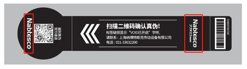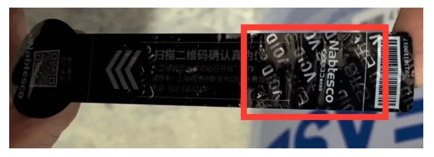 如遇到露出“VOID已开启”字样的标签,表示此张标签是从正品润滑剂产品上撕取,重新黏贴的。即使扫码验证为“正品”,仍存在假冒伪劣的可能性。如采购时遇到露出“VOID已开启”字样的标签,请立即与纳博特斯克联系。