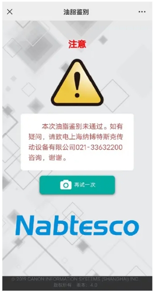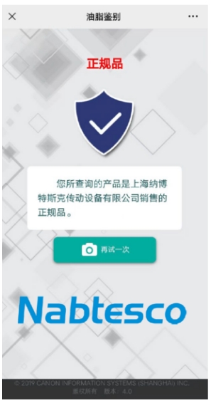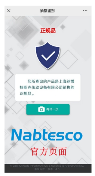 验证结果页面没有“Nabtesco”LOGO的,鉴别标签和验证渠道可能存在假冒伪劣的风险。该润滑剂为非正规渠道产品,请勿使用,并立即与我司联系。