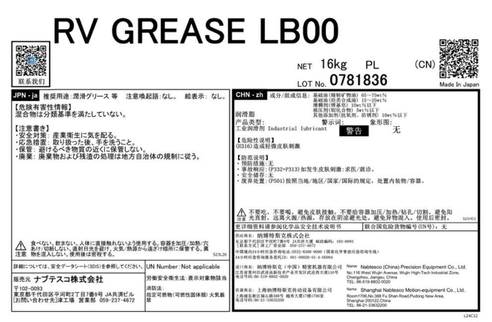 请在采购时留意,未贴标签(鉴别标签及进口标签)、标签(鉴别标签及进口标签)不完整、鉴别标签露出“VOID已开启”字样、未能通过微信公众号(上海纳博特斯克传动设备有限公司)【油脂鉴别】为“正品”的润滑剂均有假冒伪劣产品的可能。如有任何异常,请立即与纳博特斯克联系。