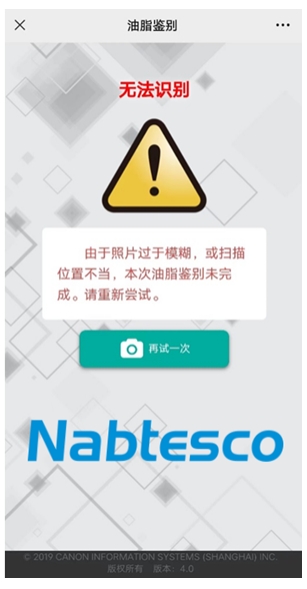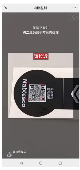 如采购时遇到标签上未标有“Nabtesco”LOGO,或者使用微信“扫一扫”功能扫描二维码后未进入官方公众号(上海纳博特斯克传动设备有限公司),而是进入其他鉴别页面的,则该张标签及润滑剂有被仿冒造假的风险。请勿开封使用,尽快联系我司。具体验证方式请参考下文【油脂鉴别操作流程】。