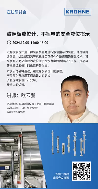 12月5日下午2:00-3:00,科隆仪表专家将会通过在线研讨会来为大家深度介绍磁翻板液位计的原理,产品系列及应用案例来让大家更加了解这种液位计在冗余,安全上的优势。