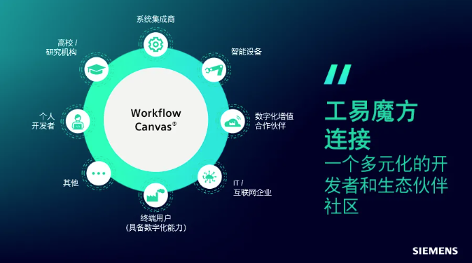 西门子Workflow Canvas(工易魔方)作为西门子 Xcelerator 的开放工具及重要技术支撑,是一个用于赋能西门子及其生态合作伙伴的云原生IT/OT集成工具包,可助力制造业打造柔性产线、实现 IT/OT 的数字化快速集成与工业物联网应用开发、助力数据资产建立与价值释放,目前已与50余家伙伴达成合作,其中已有20余家加入西门子 Xcelerator 繁星计划,共创联合解决方案。它针对复杂工业场景,通过图形化、拖拽式工作流,标准化的通用信息模型,跨平台的工作流引擎,以及西门子工业信息中心(IIH)与知识中台的数据融合能力,提供了可定制、开放、敏捷的数字化融合交付方案,从而服务不同领域的企业。
