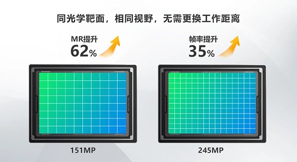 MR是屏检行业中的放大倍率的概念,意味着被测屏幕上的一个显示RGB像素所对应的相机像素数。行业内一般要求做到MR≥3。传统1.5亿像素相机在检测8K屏幕时需要多相机拼接才能实现,2.45亿像素则可以实现单相机就提供足够的精度。