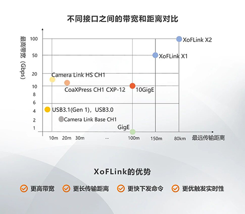 相机采用XoFLink传输接口,配合光模块可达到50G的最大带宽和150m的传输距离,并且相较于传统高速接口如CoaXPress和Camera Link,XoFLink在方案复杂度和传输稳定性以及响应速度上都有明显优势。