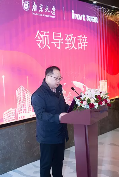 陈谦书记在仪式上致欢迎辞,向来宾介绍了学校办学特色与优势,他表示,南京大学一直致力于学术的深度探索与突破,并积极践行社会责任。此次与英威腾携手共建联合实验室,是学校产学研融合战略的生动实践。双方将汇聚智慧与力量,攻克行业关键技术难题,为产业的整体升级与可持续发展注入源源不断的智慧动力。