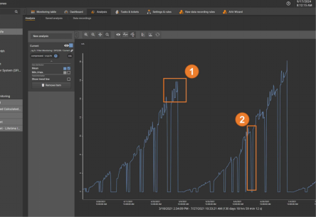 在这里可以看出,测量值呈指数级数,这表明堵塞,即过滤器的磨损。还可以确定系统运行的各个阶段(2)和从旧过滤器到新过滤器的转换时间(1)